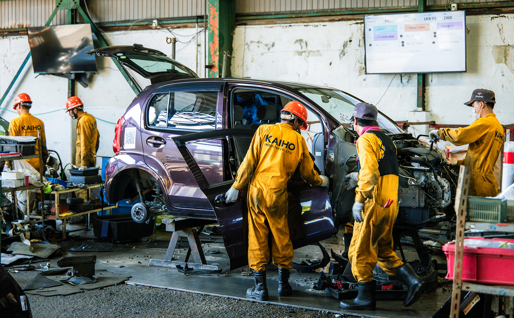 Kaiho Industry is committed to reducing environmental impact by properly dismantling end of life vehicles, promoting the reuse of parts, and actively advancing resource recycling.